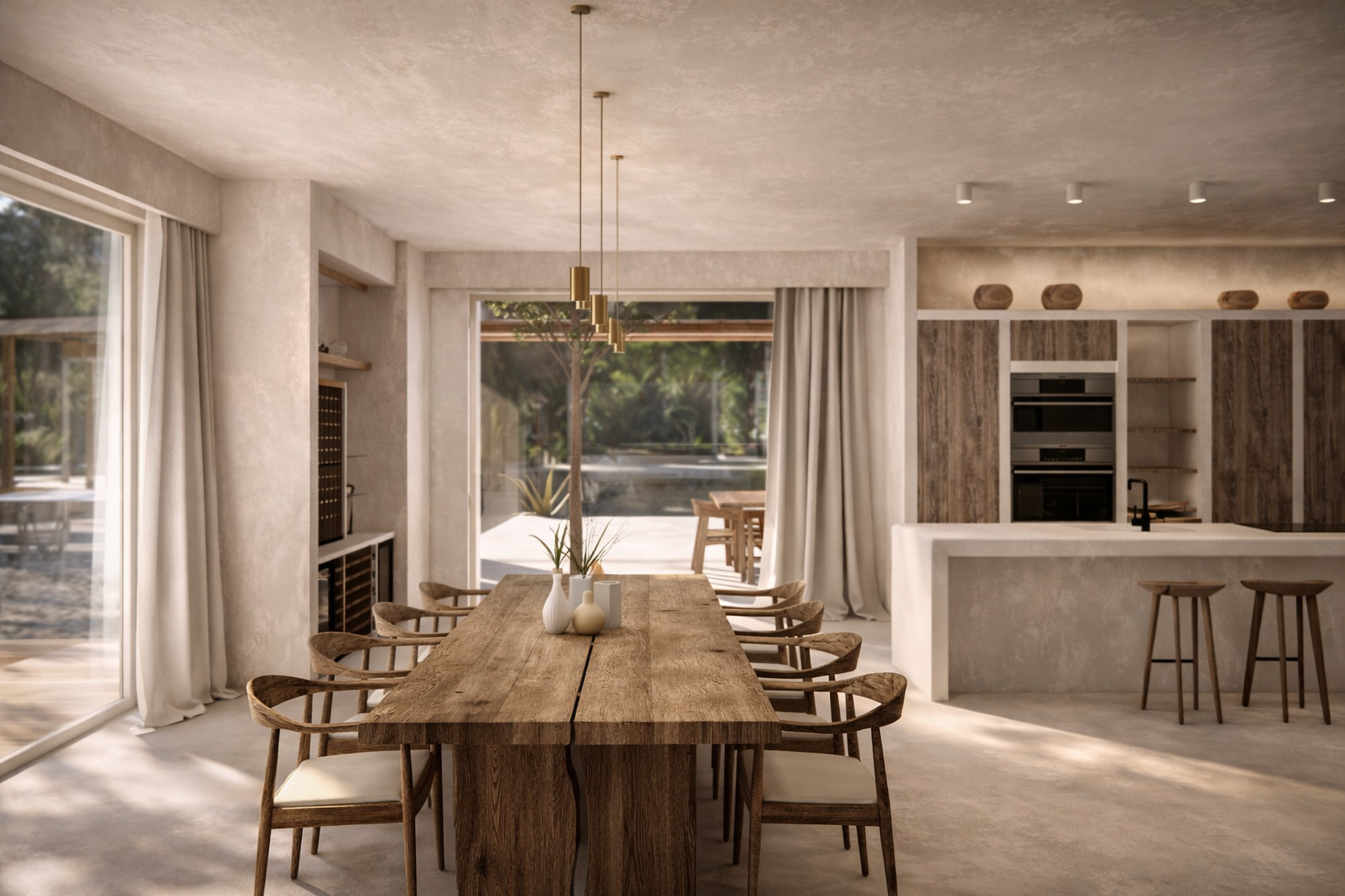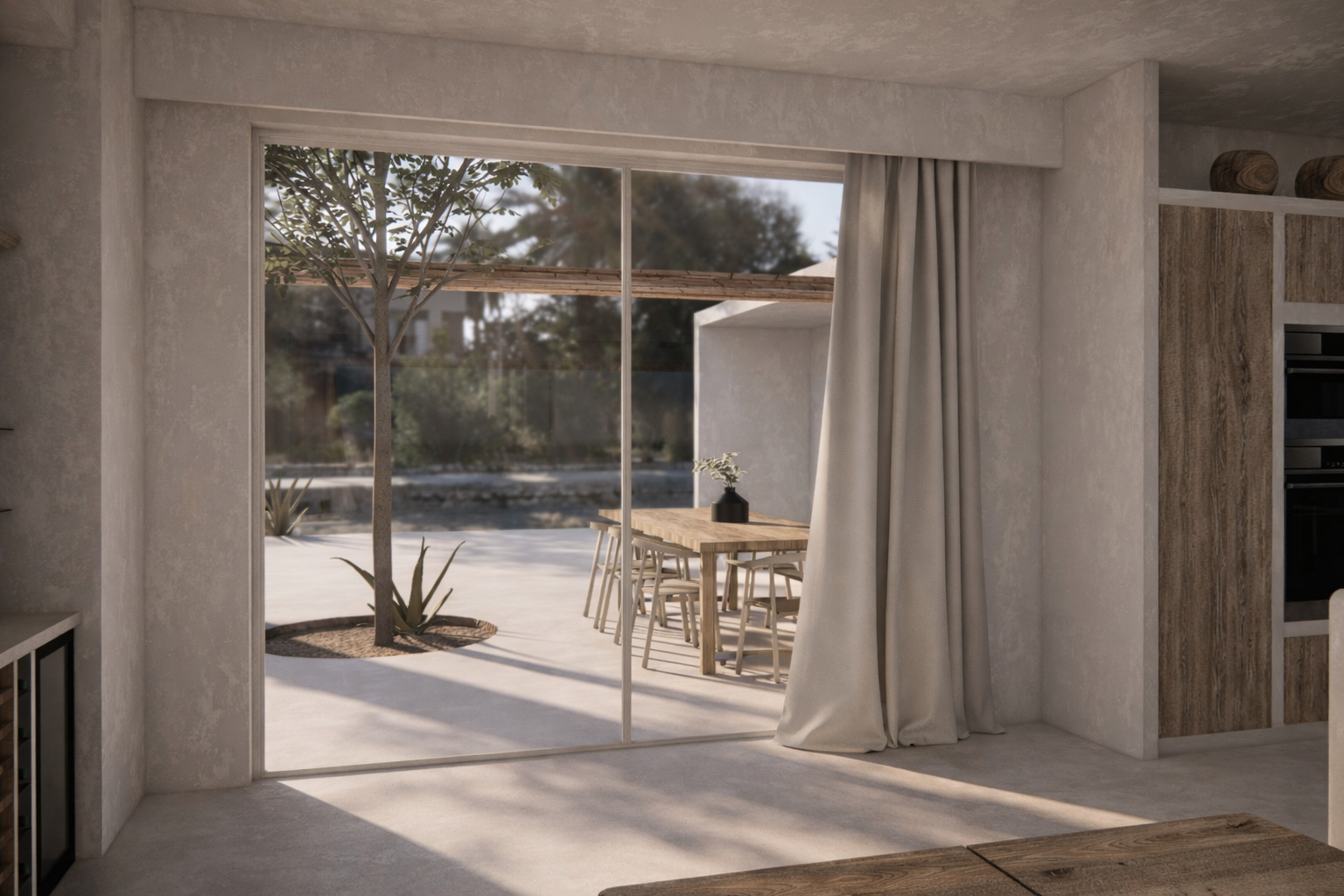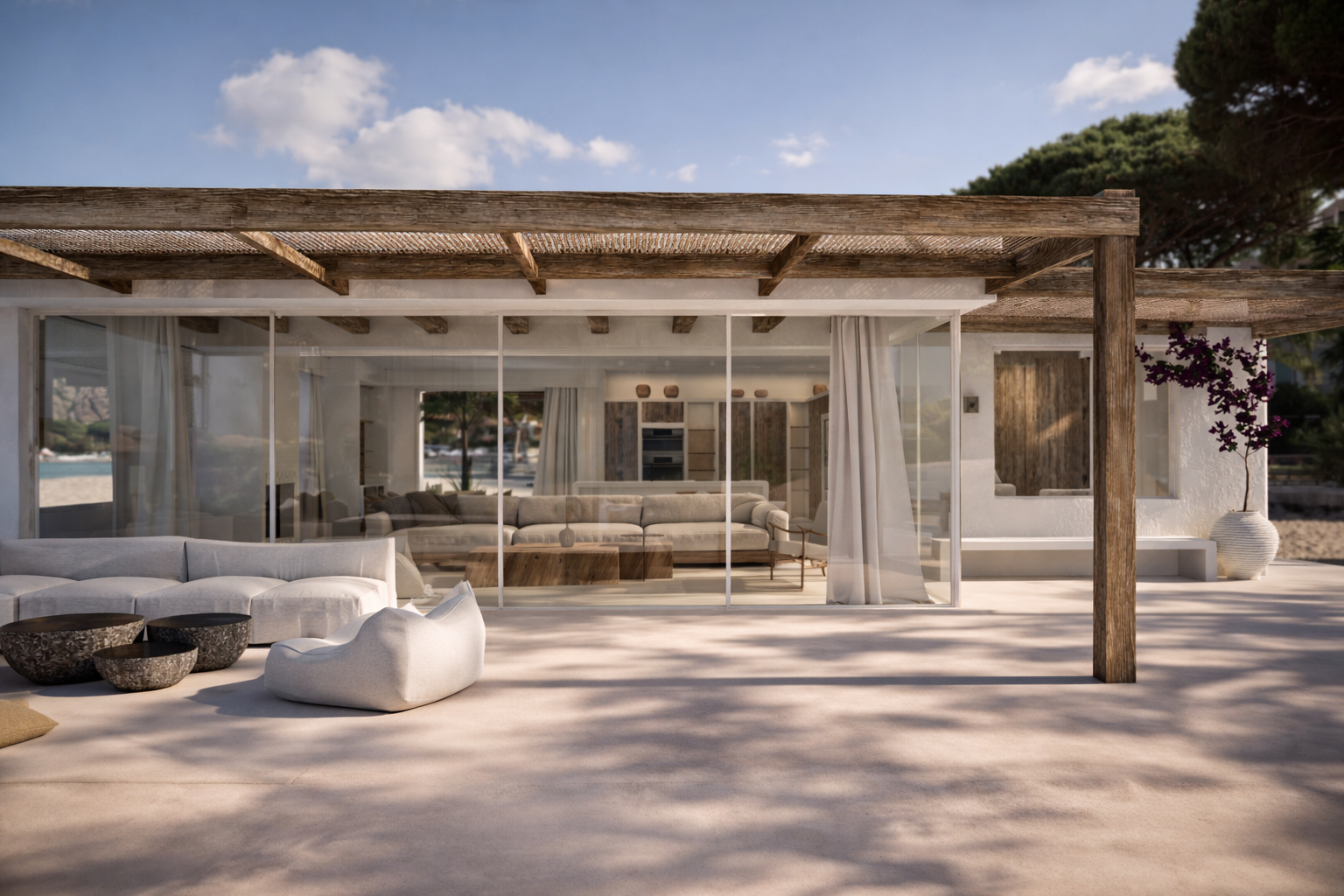 Light plays a central role, sliding across surfaces and revealing the subtle imperfections of plaster, the warmth of timber, and the depth of shadow. The exterior platform extends the living space outward, blurring the threshold between built form and landscape.