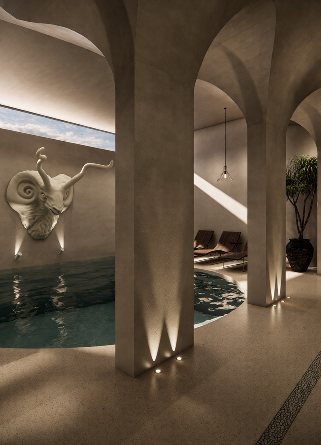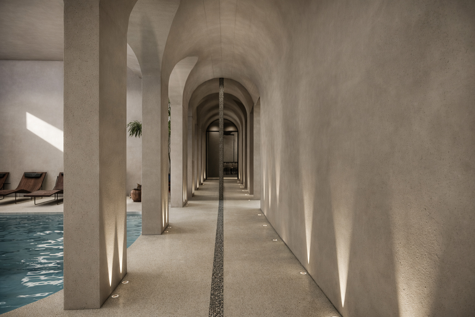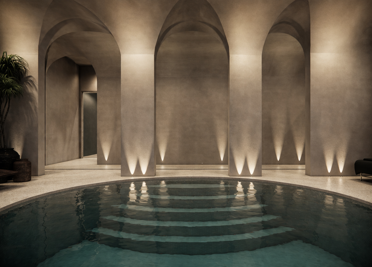 The still water reflects both form and atmosphere, amplifying the sense of calm and introspection. Natural light enters discreetly from above, balancing the warmth of the artificial illumination and reinforcing the spatial depth.
