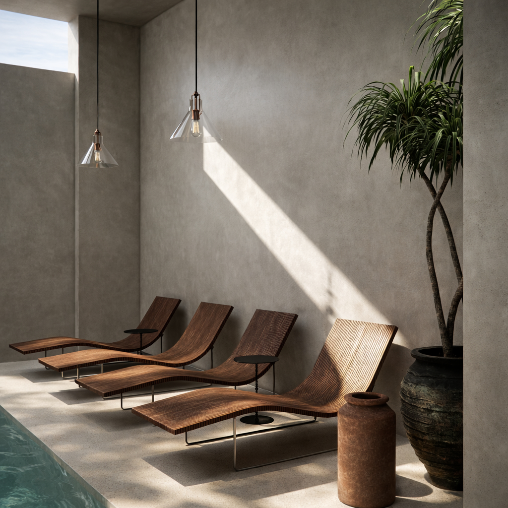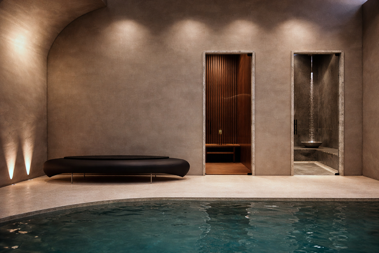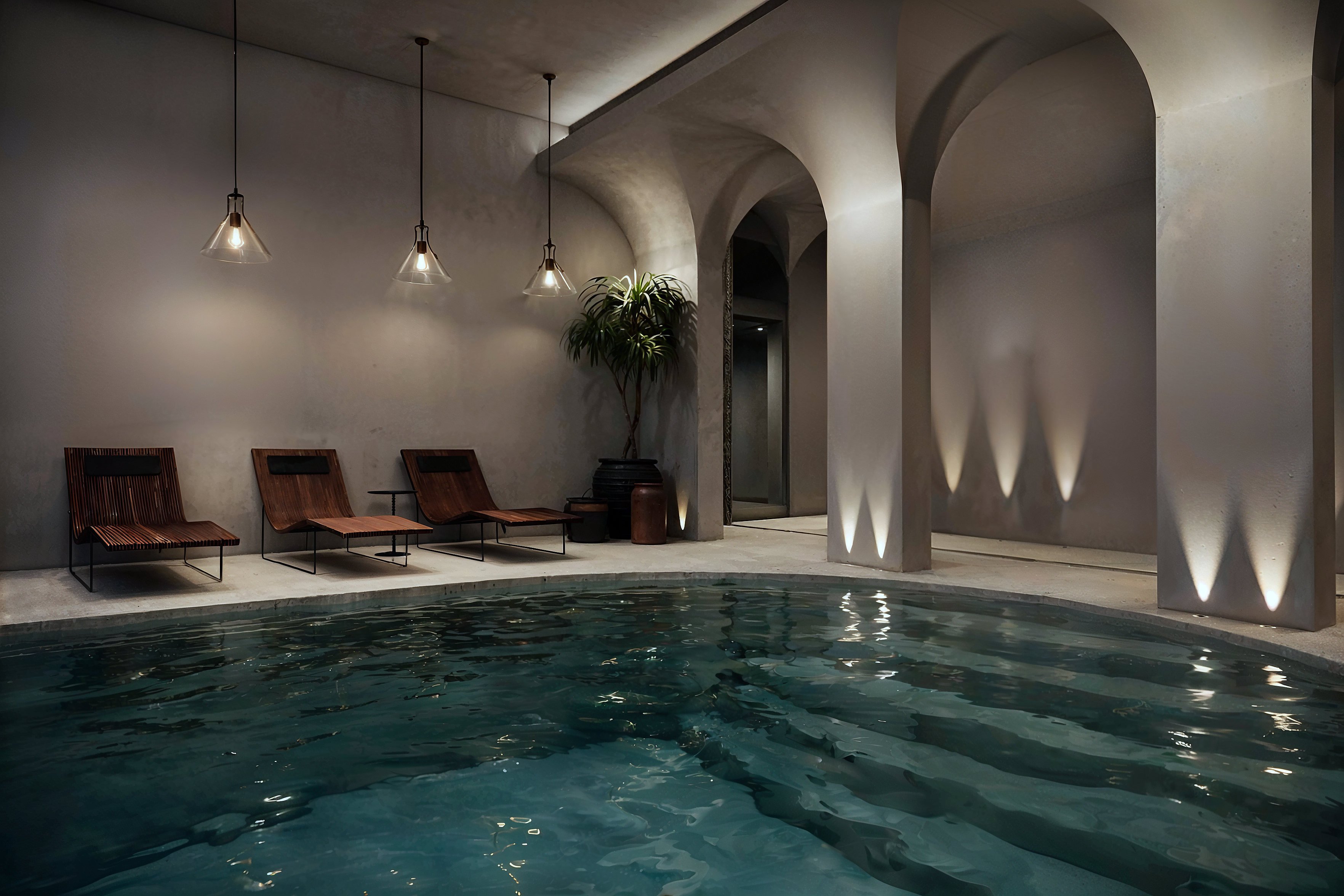 The still water reflects both form and atmosphere, amplifying the sense of calm and introspection. Natural light enters discreetly from above, balancing the warmth of the artificial illumination and reinforcing the spatial depth.