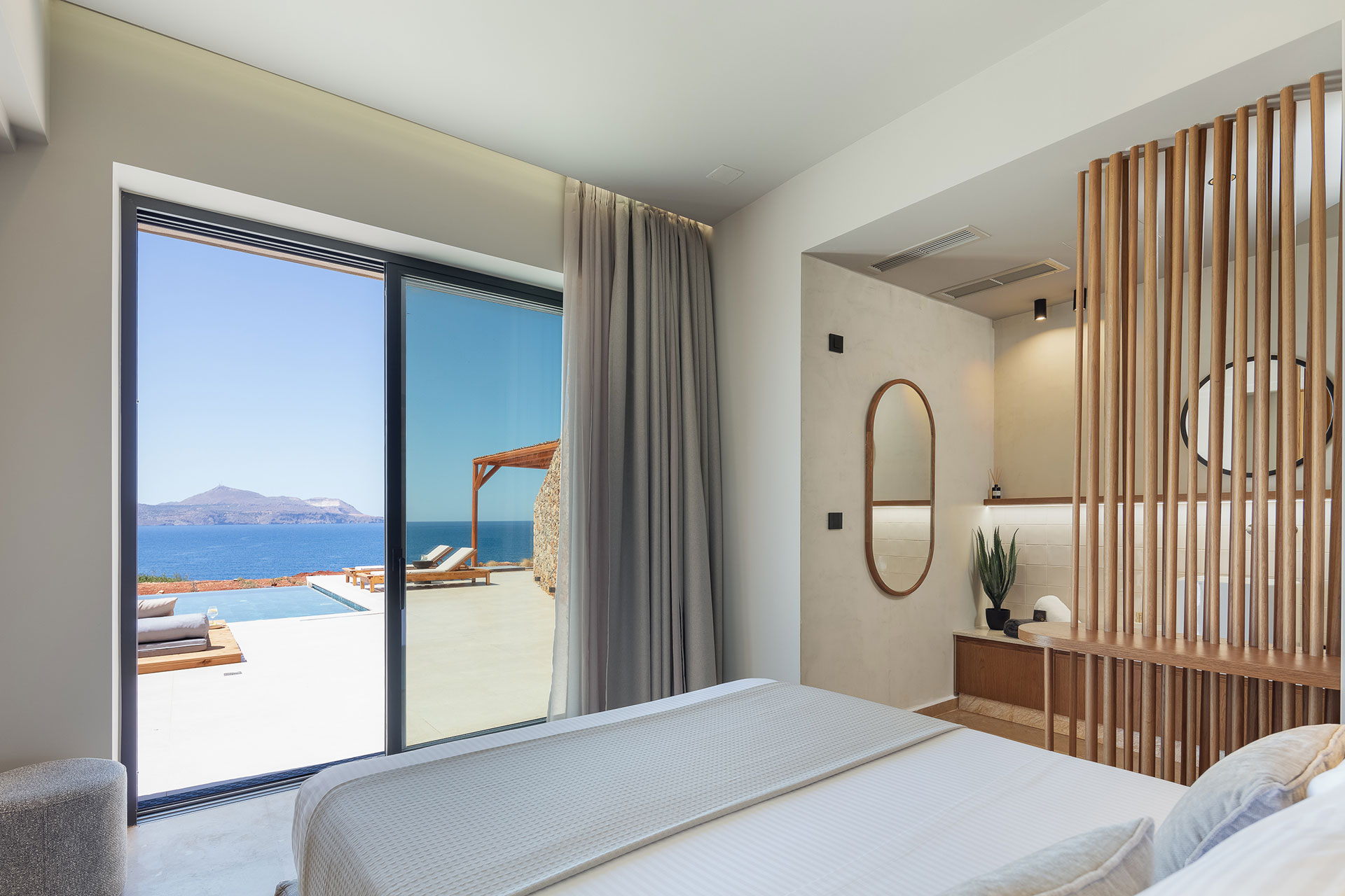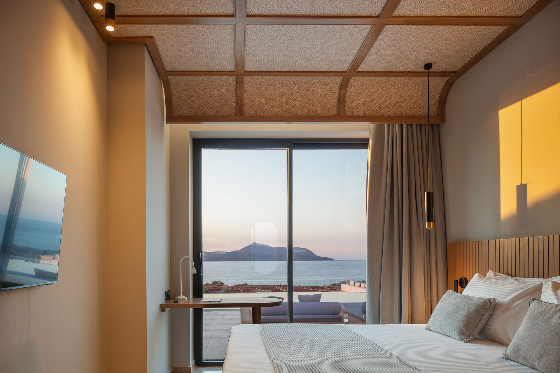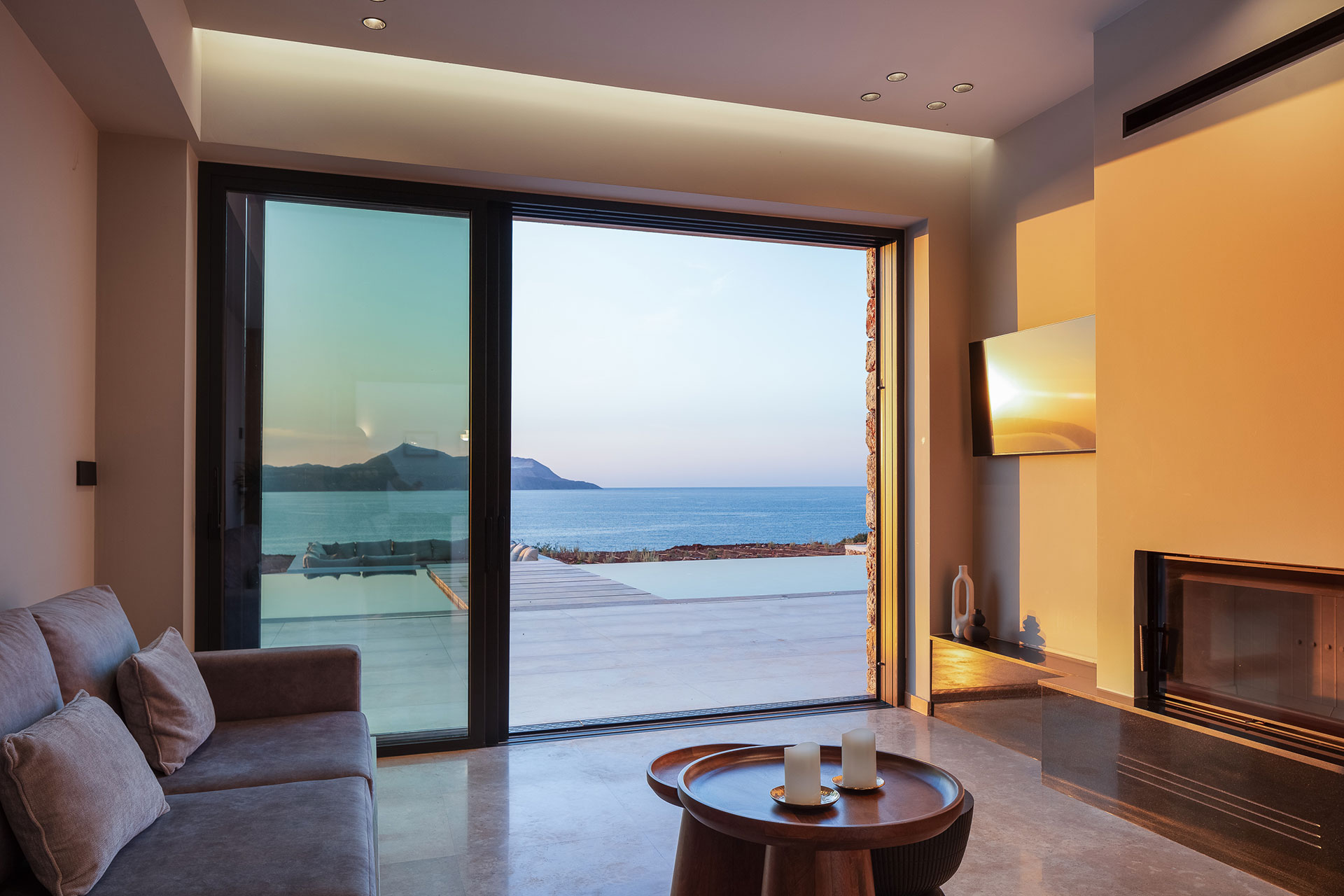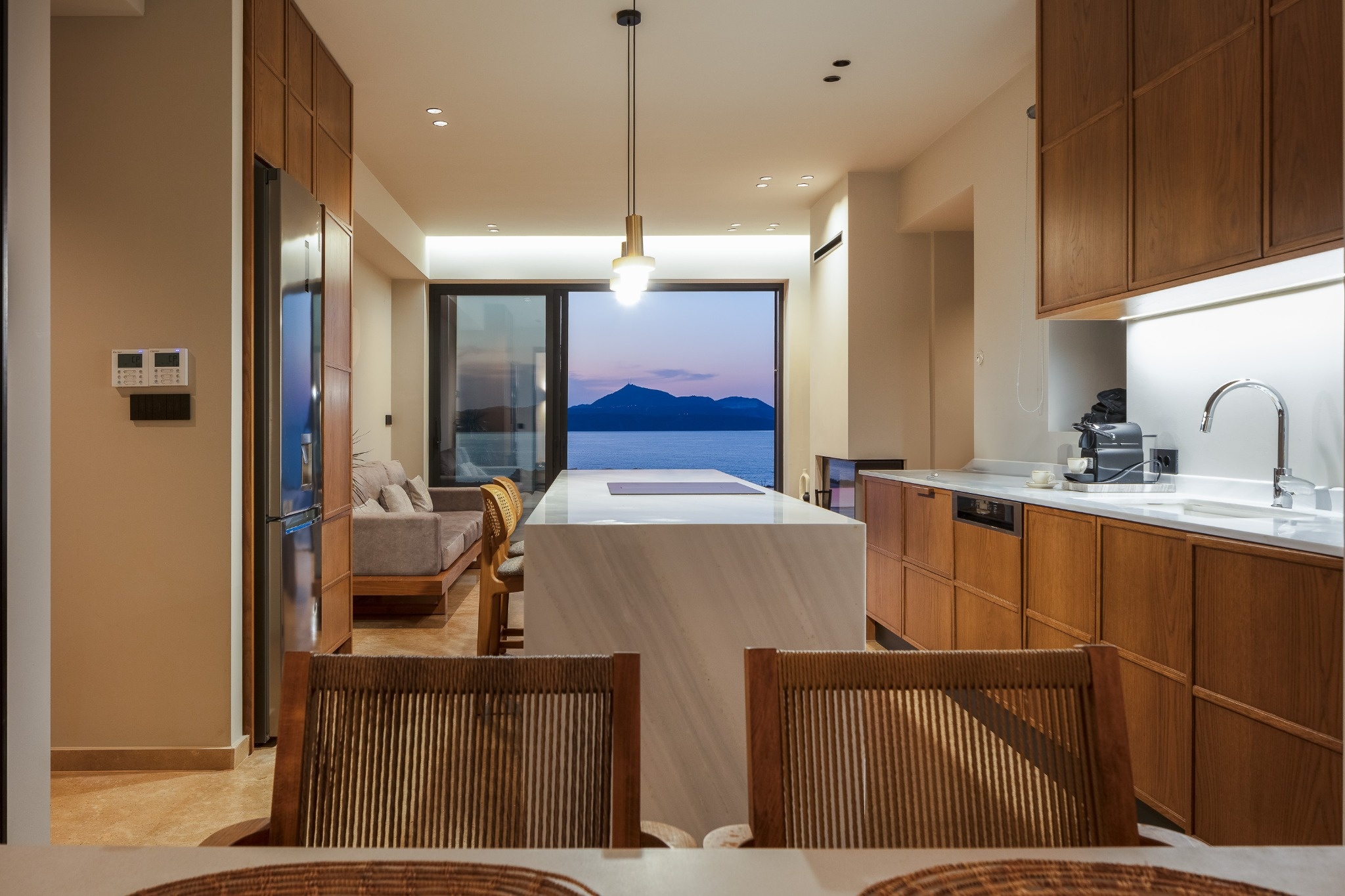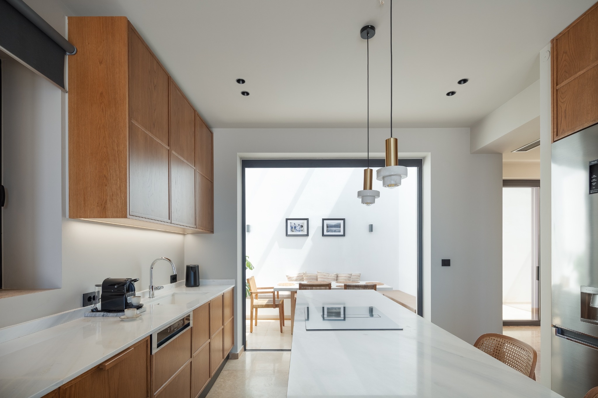Large openings frame views of the historic cityscape and the distant mountains, allowing natural light to enter the space throughout the day. The result is a serene living environment where interior and exterior merge, offering a quiet and immersive experience rooted in the character of Chania.