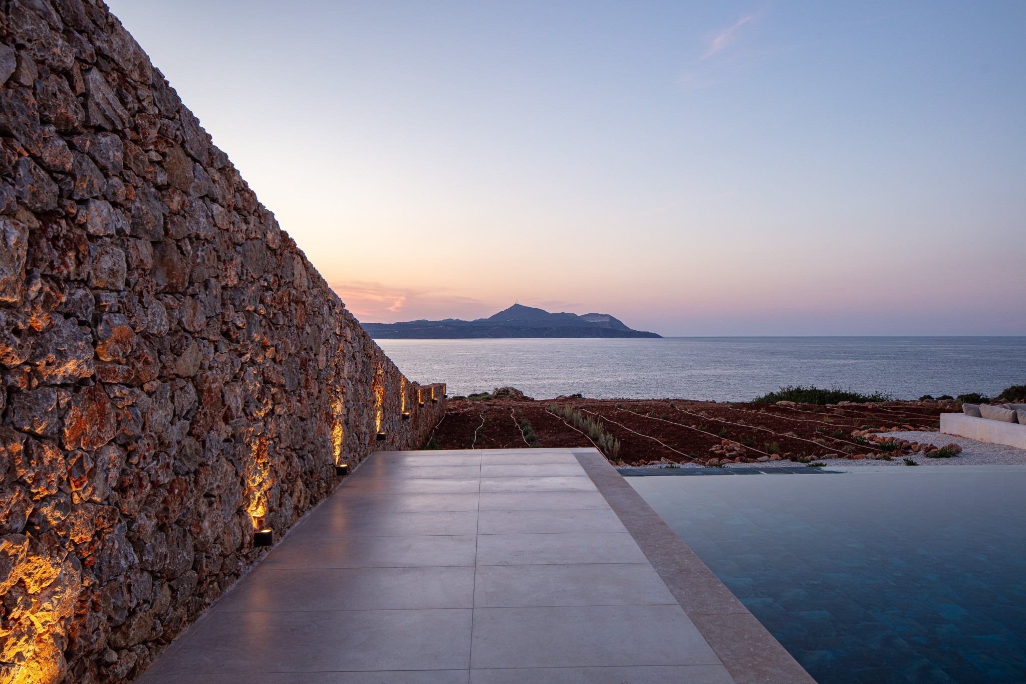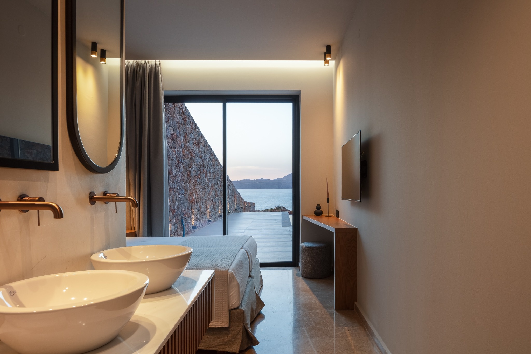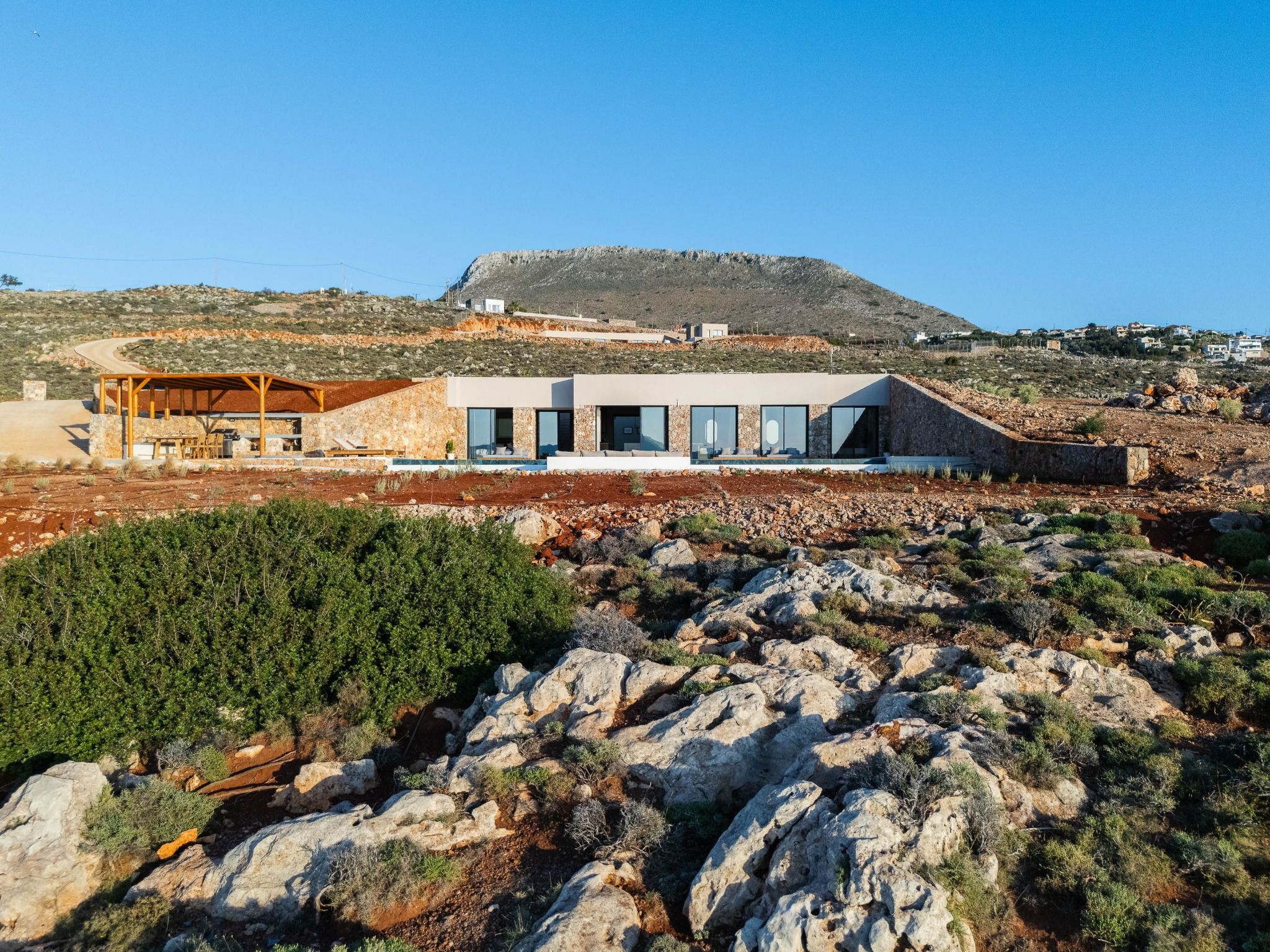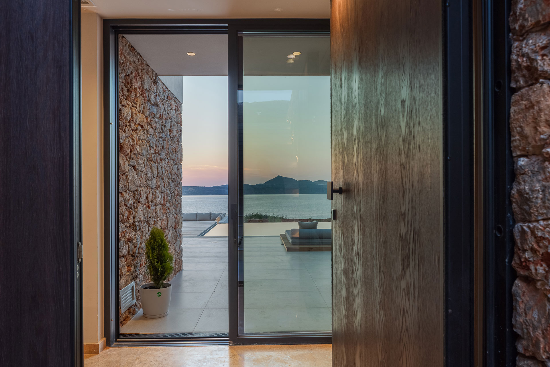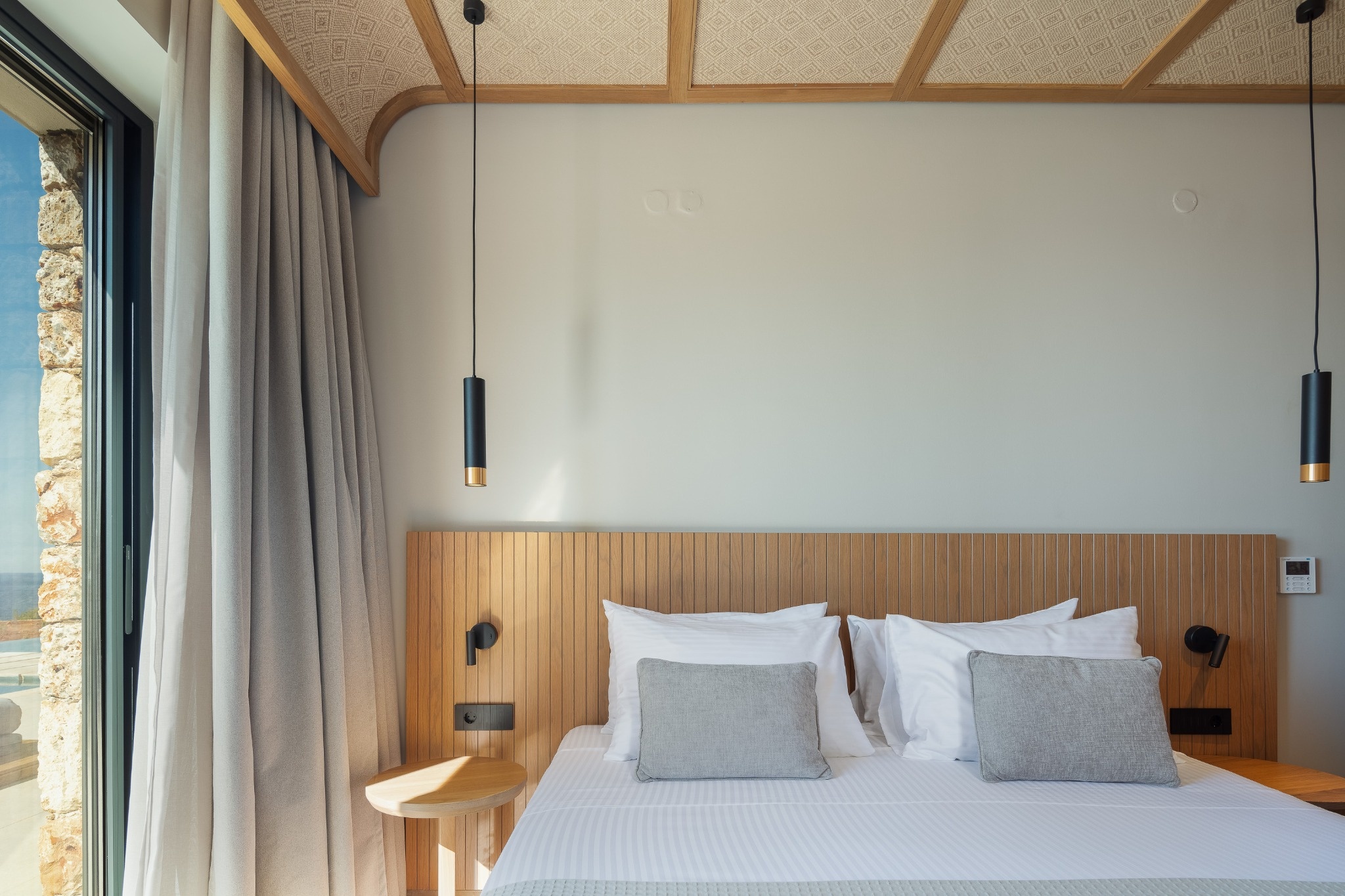 Large openings frame views of the historic cityscape and the distant mountains, allowing natural light to enter the space throughout the day. The result is a serene living environment where interior and exterior merge, offering a quiet and immersive experience rooted in the character of Chania.