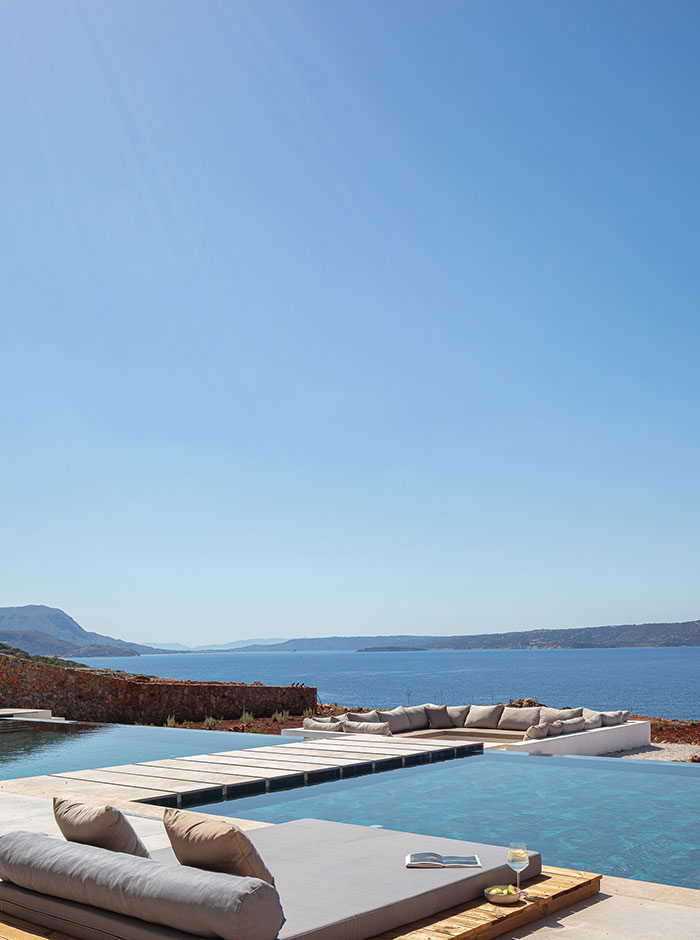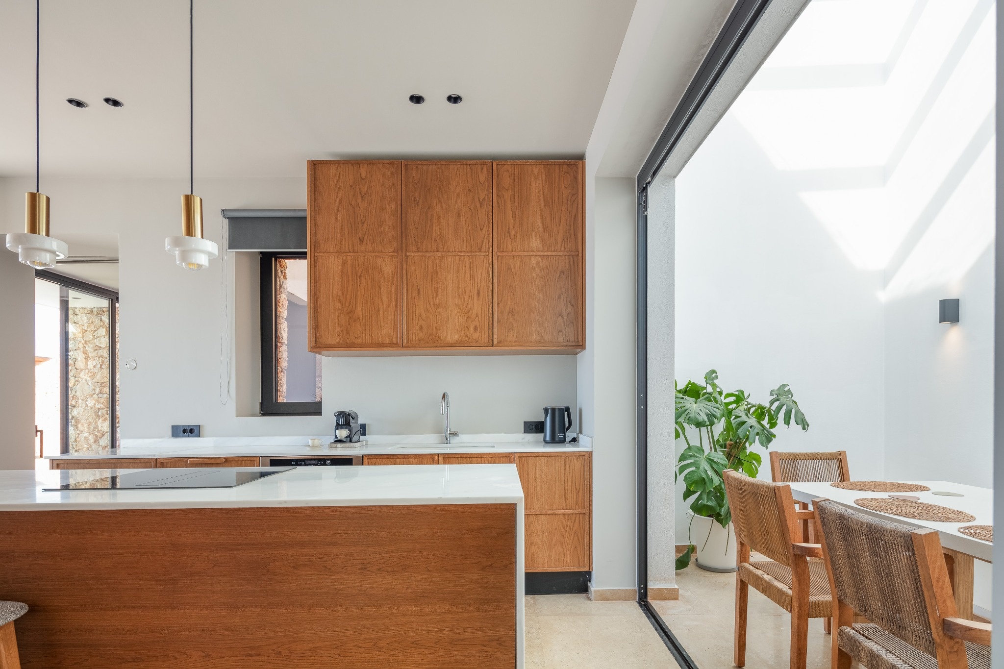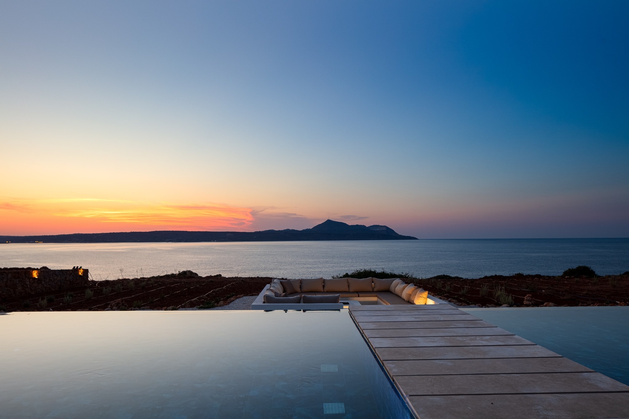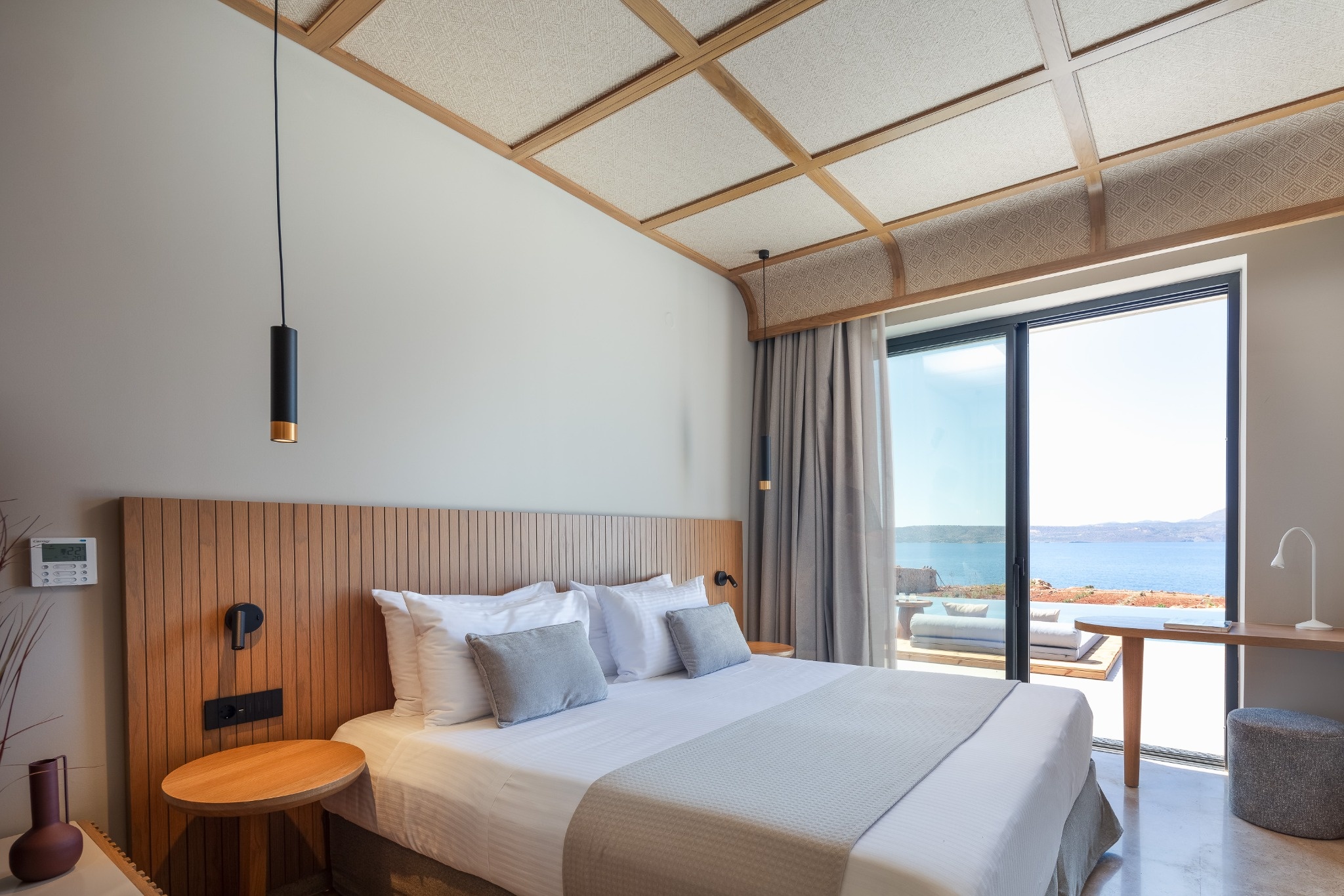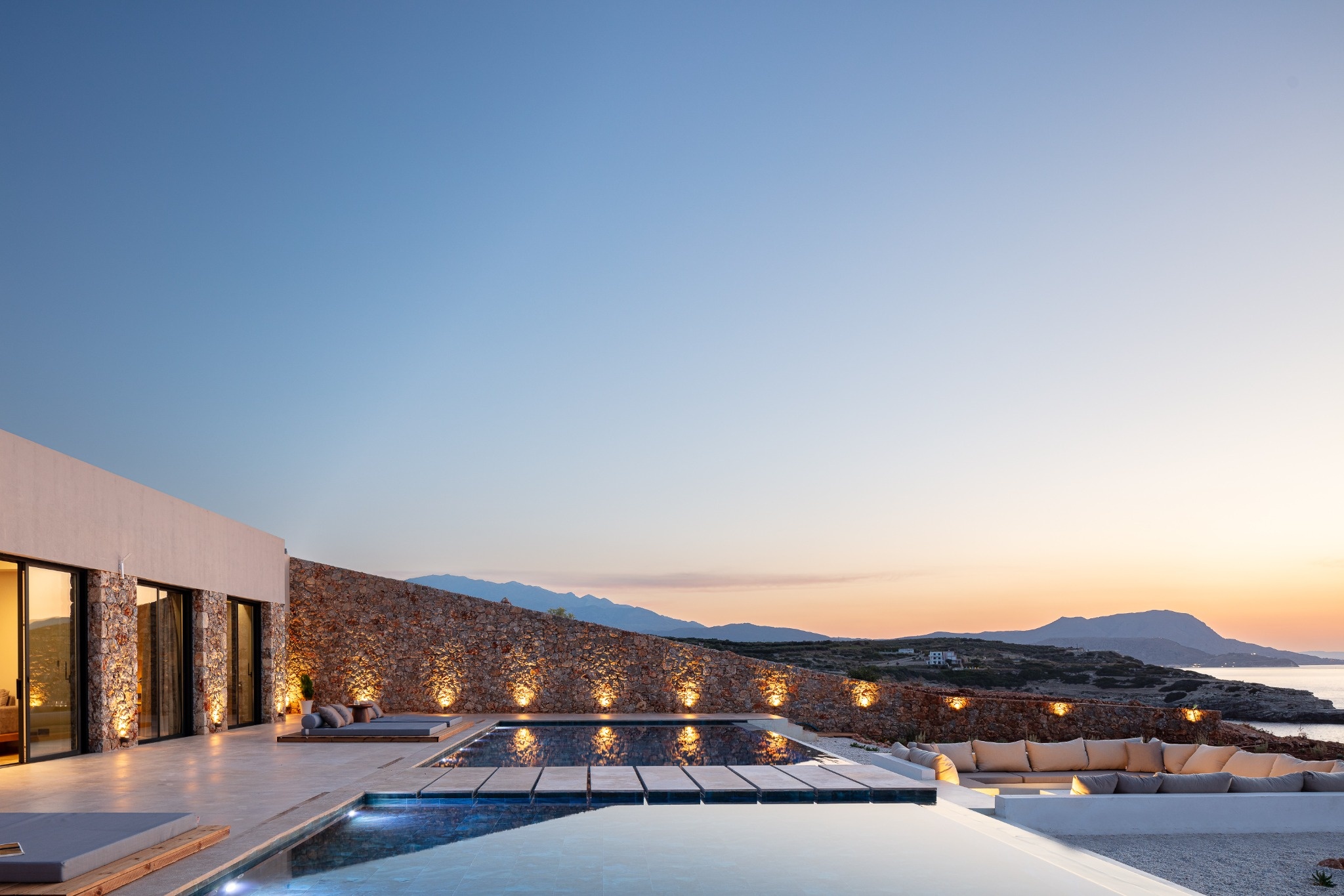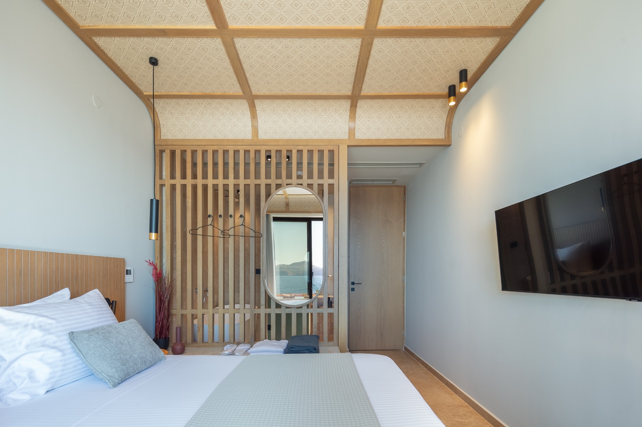 Large openings frame views of the historic cityscape and the distant mountains, allowing natural light to enter the space throughout the day. The result is a serene living environment where interior and exterior merge, offering a quiet and immersive experience rooted in the character of Chania.