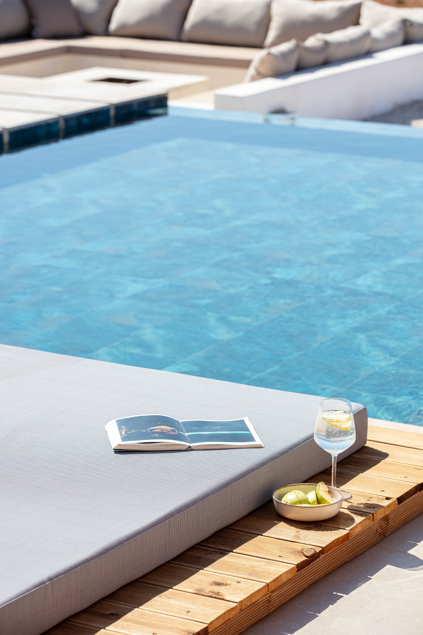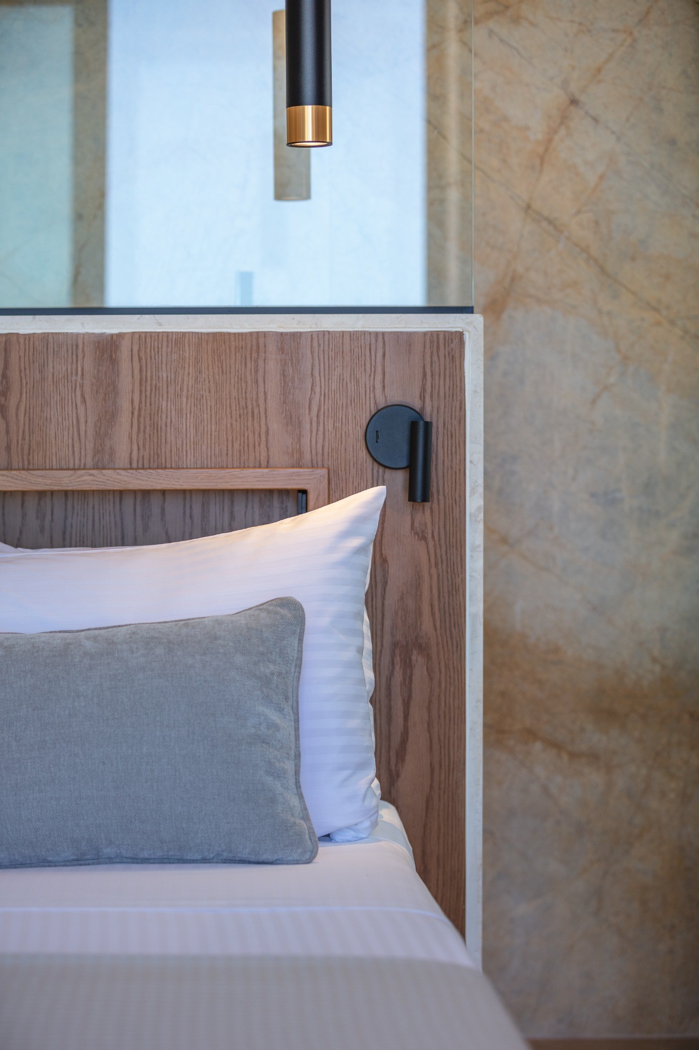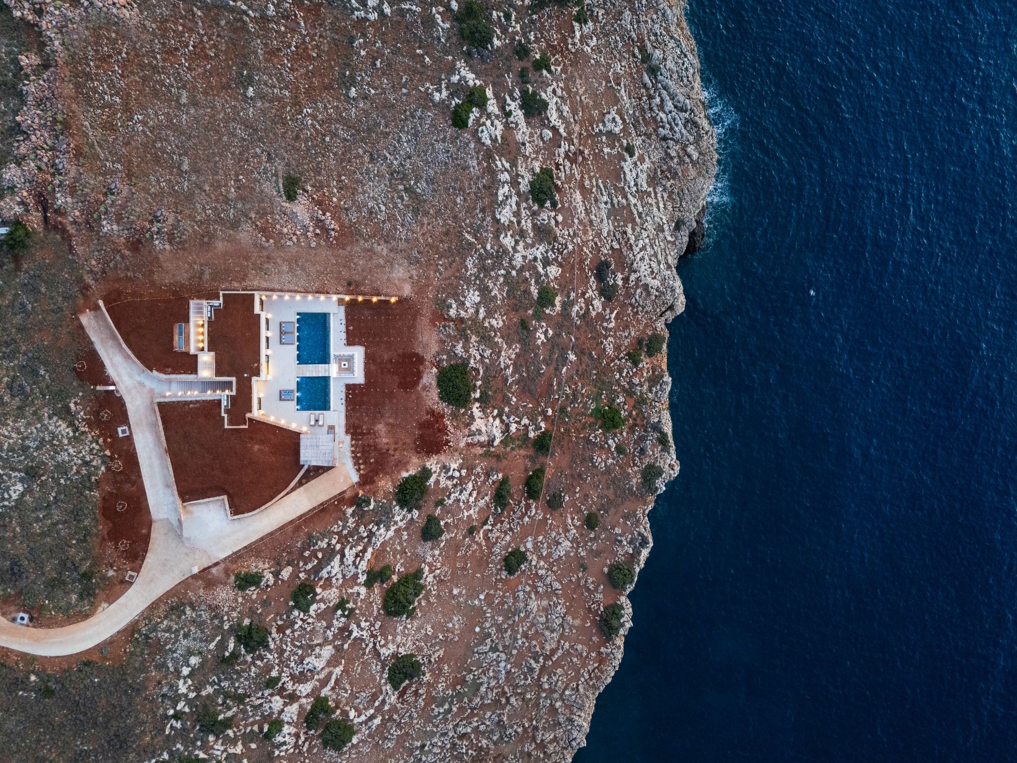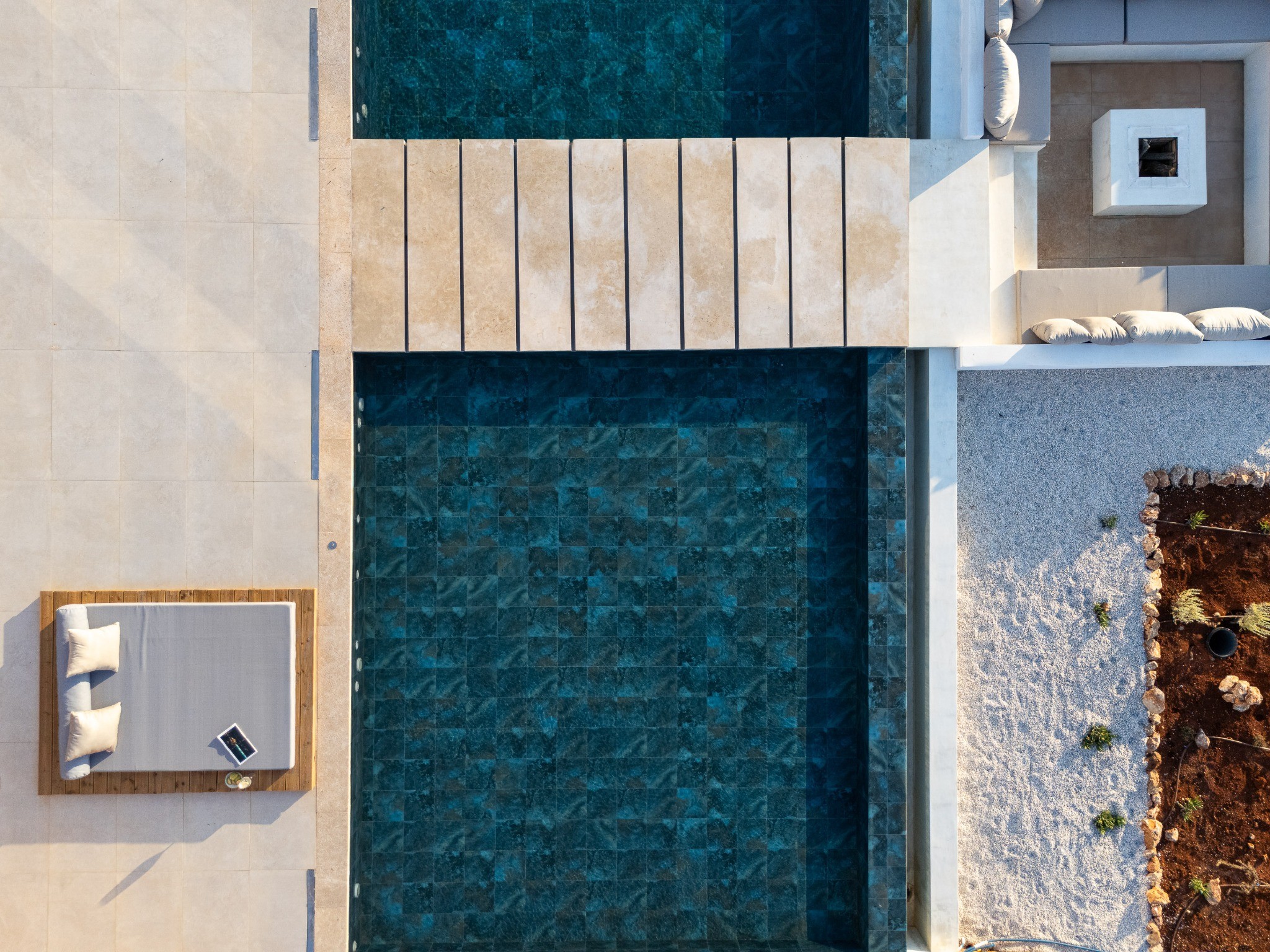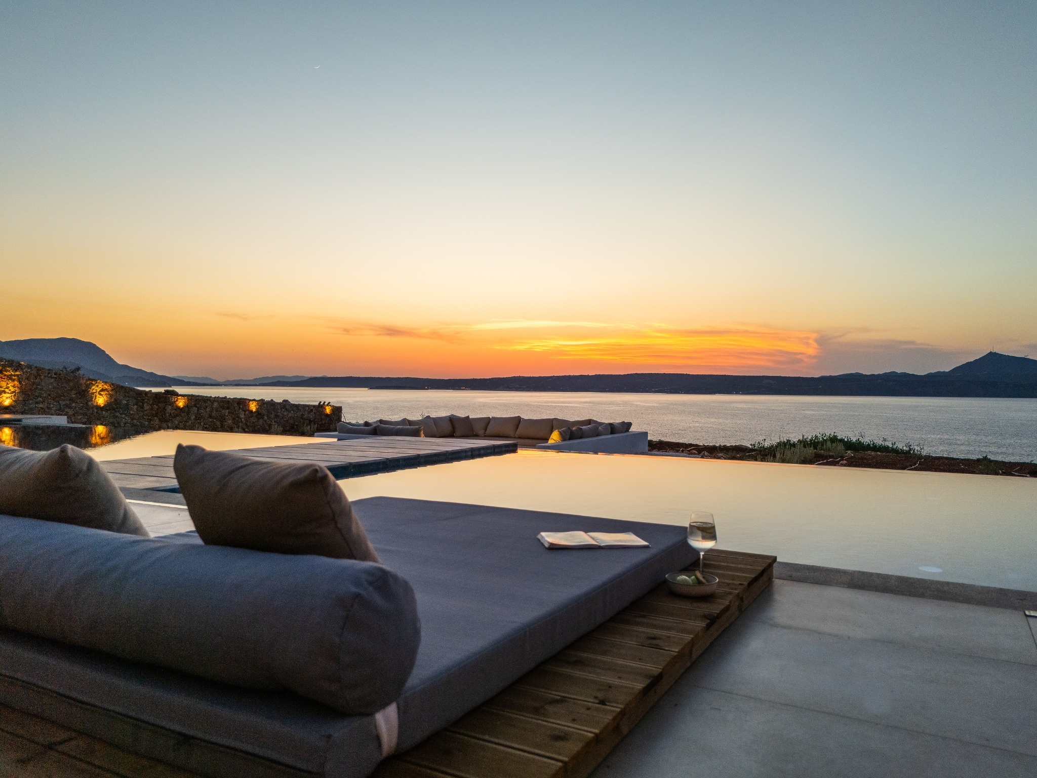 Large openings frame views of the historic cityscape and the distant mountains, allowing natural light to enter the space throughout the day. The result is a serene living environment where interior and exterior merge, offering a quiet and immersive experience rooted in the character of Chania.