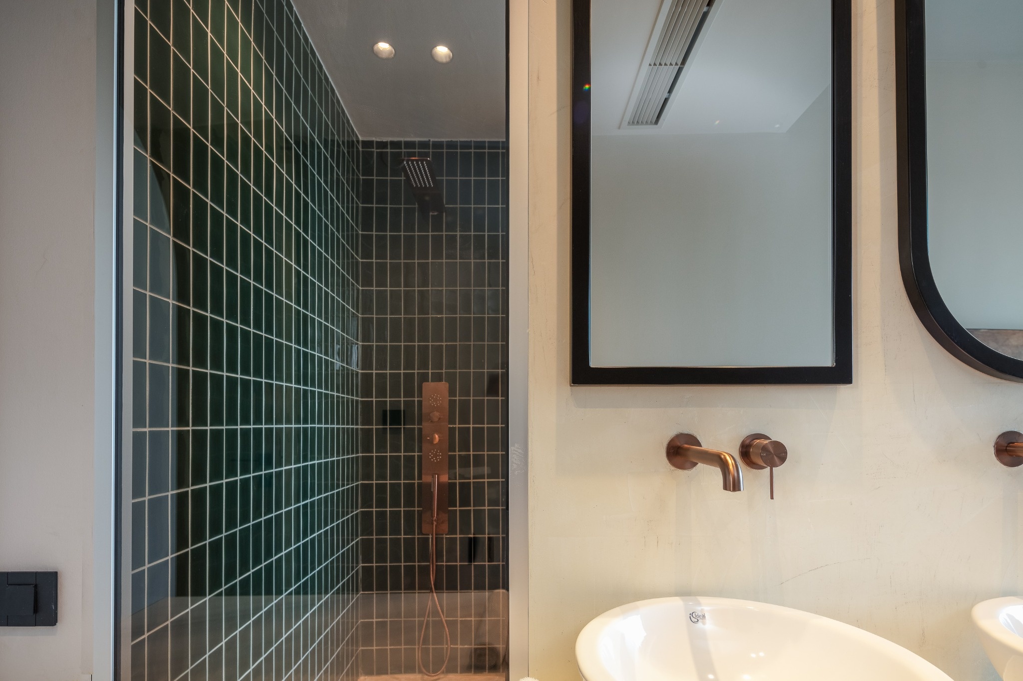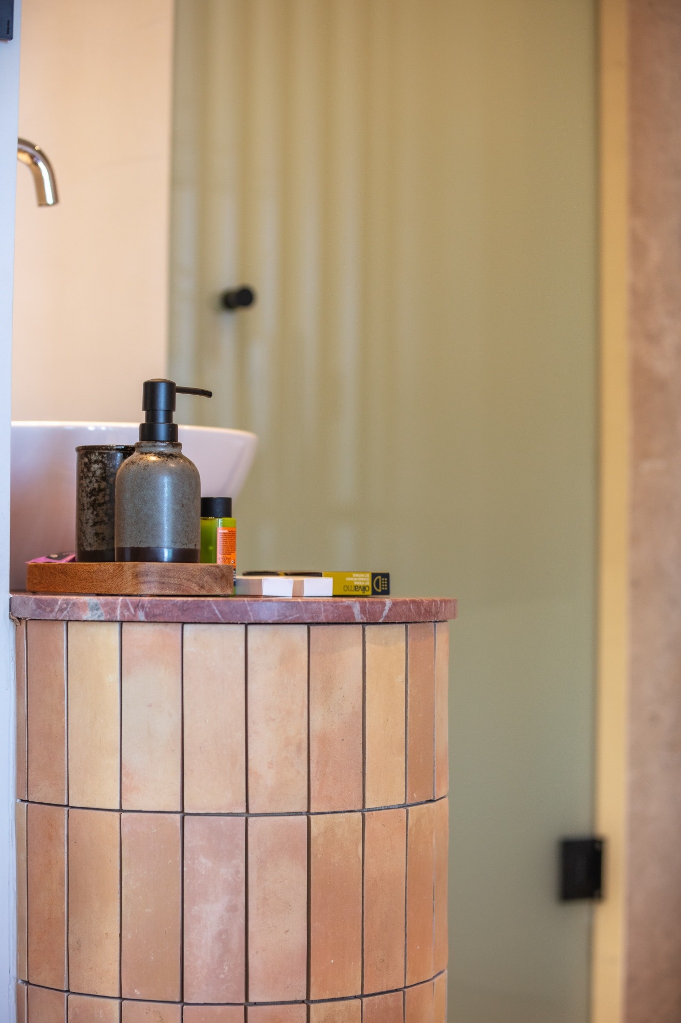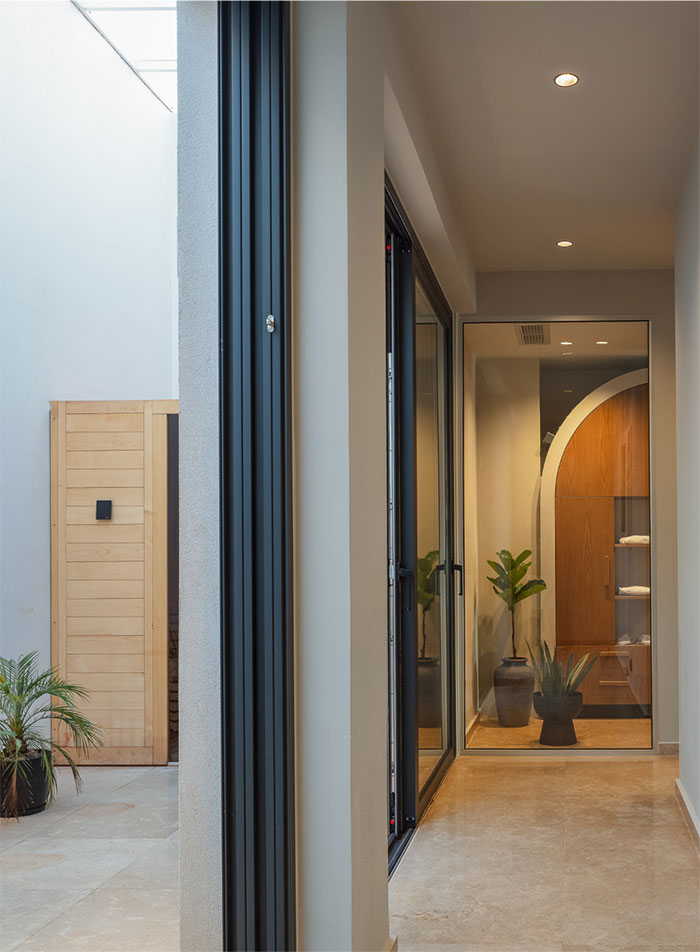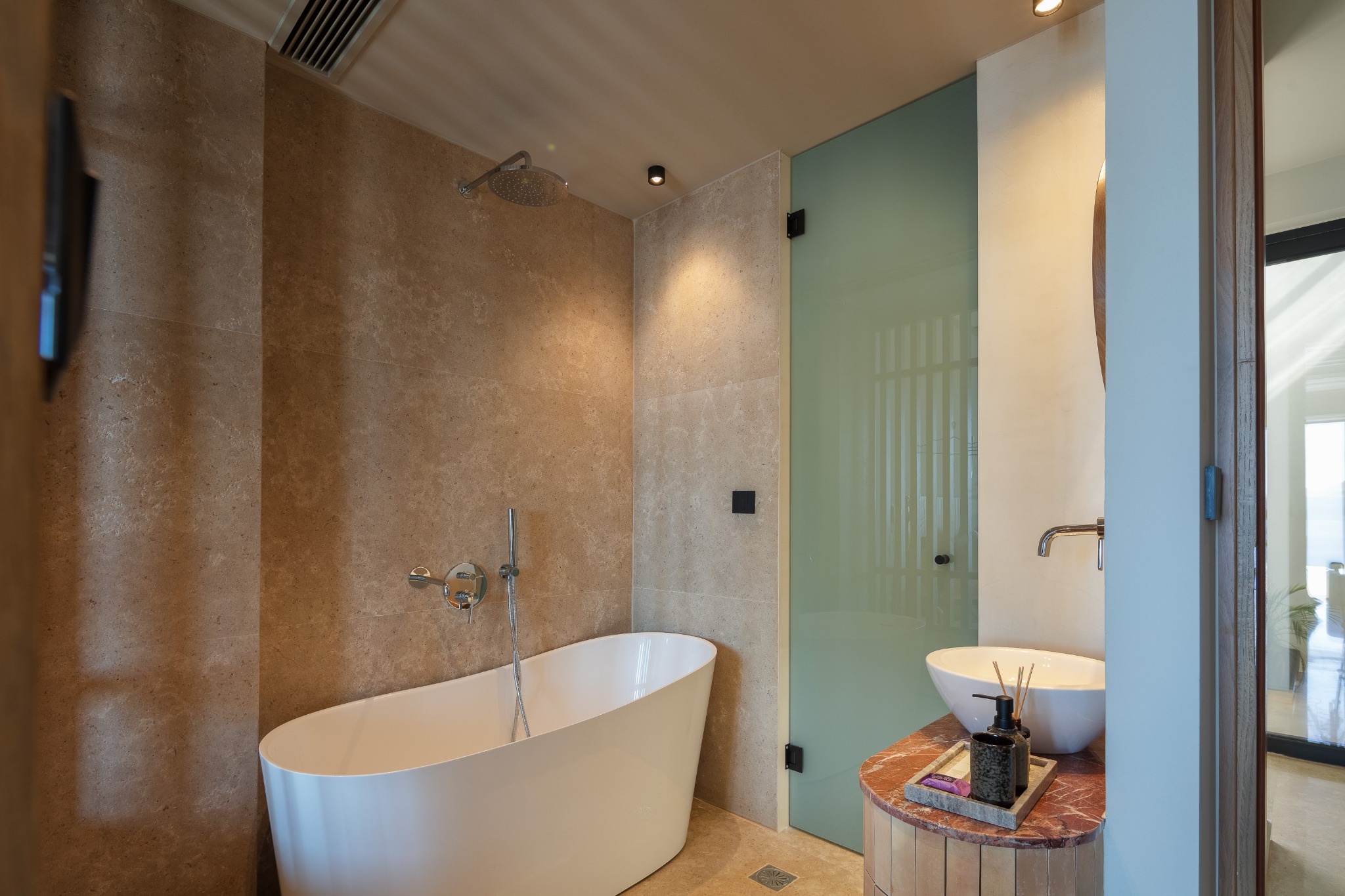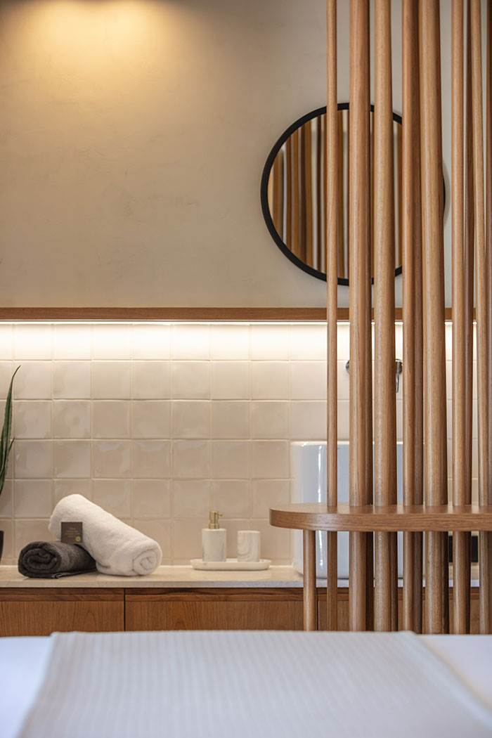 The spatial organization follows an open and fluid layout that enhances continuity between the different areas of the house. A semi-open bathroom integrated within the bedroom introduces a subtle architectural division, creating privacy while maintaining visual connection and spatial harmony.