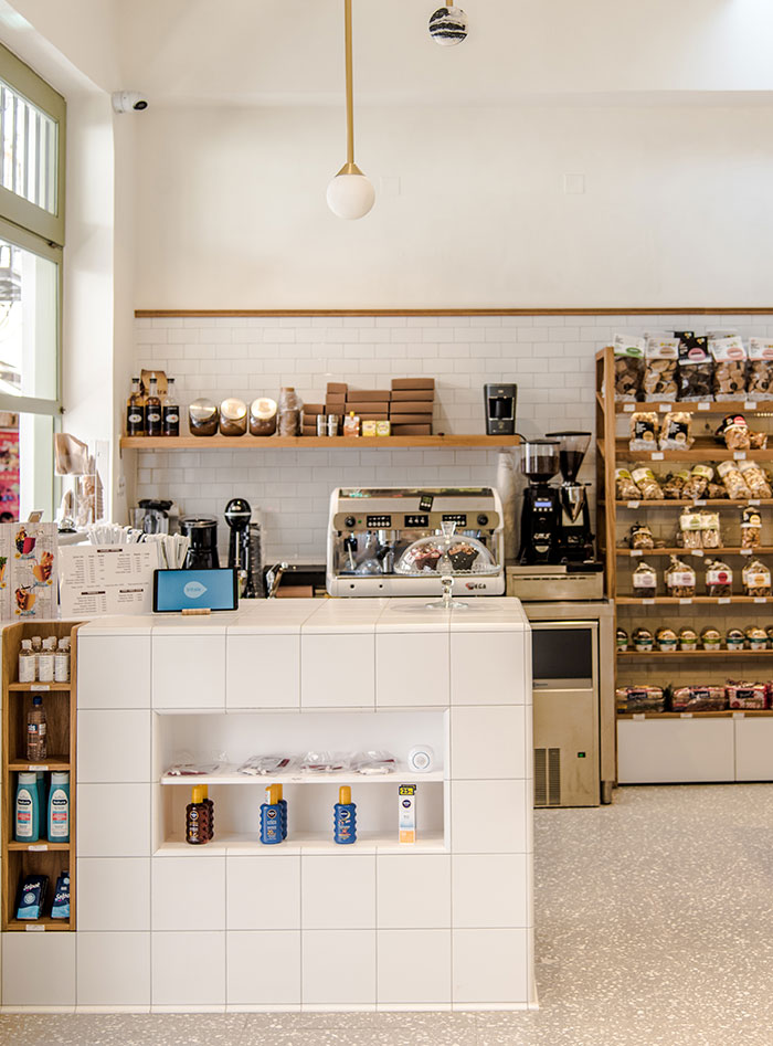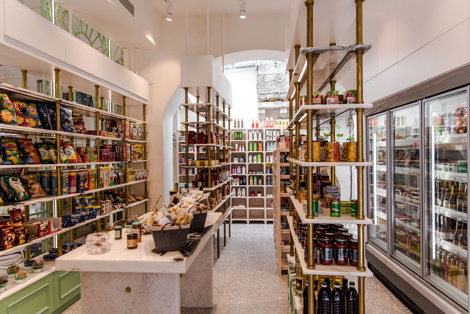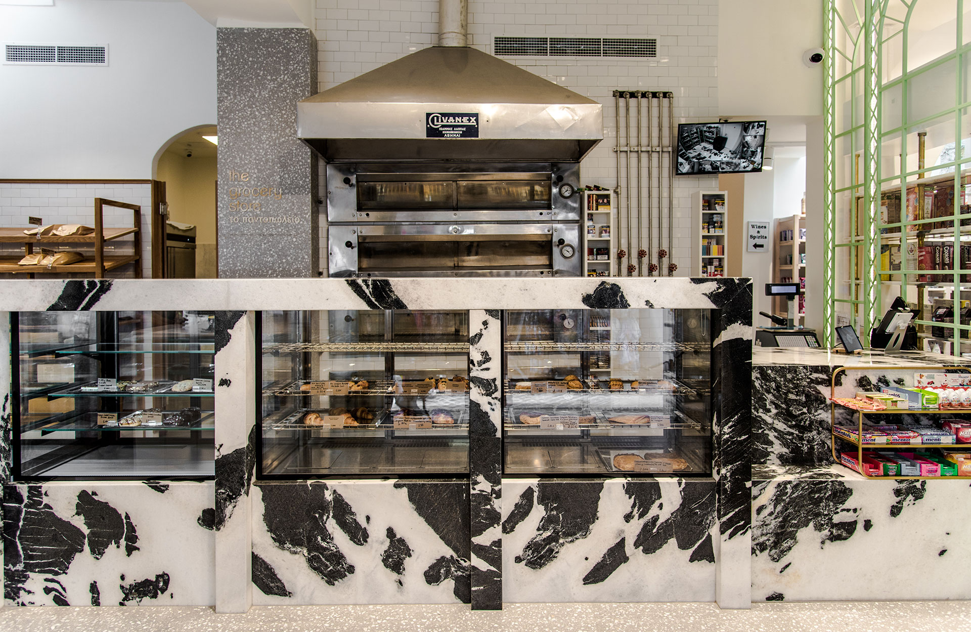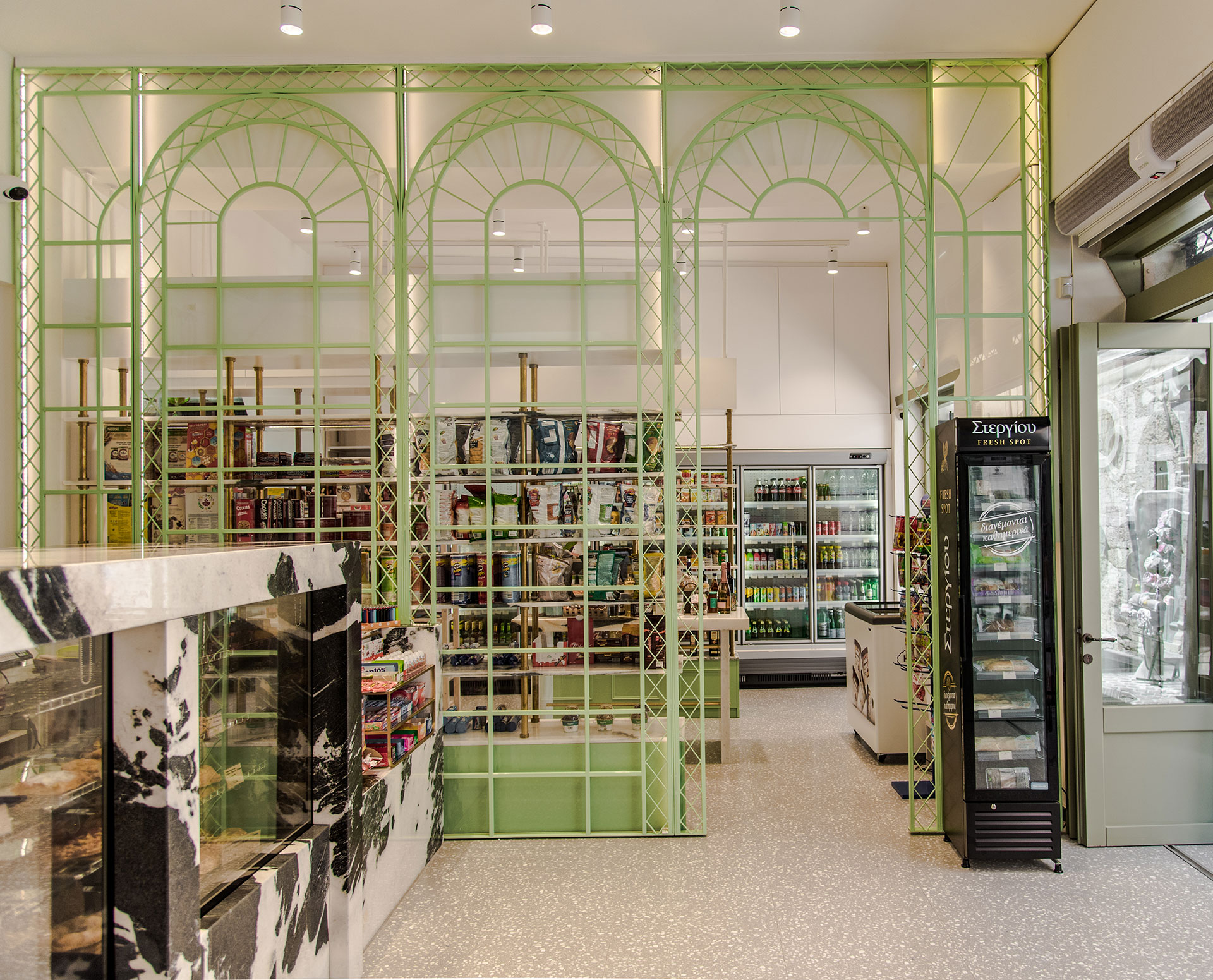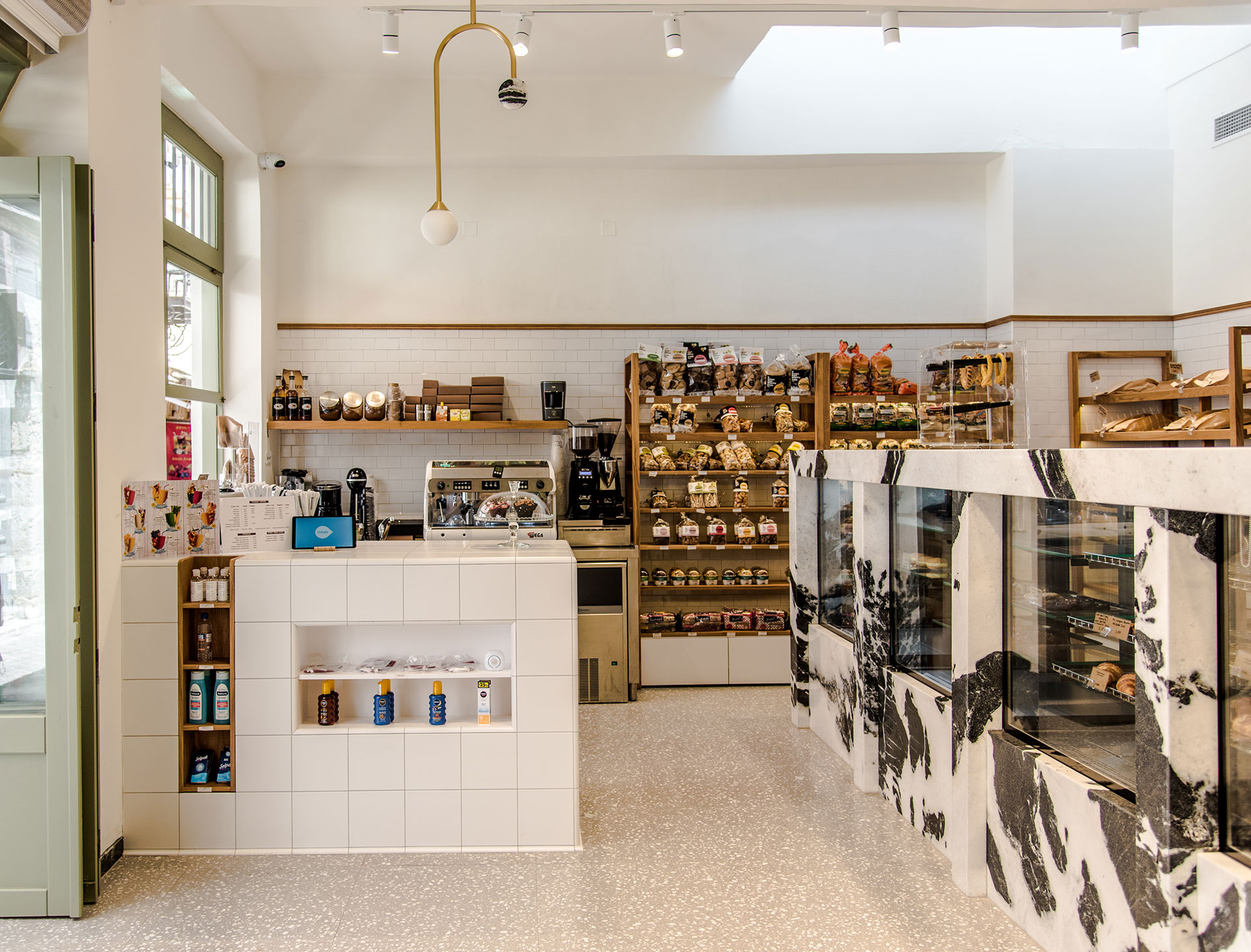 A lightweight metal structure organizes the interior and forms a subtle architectural separation between the bakery and grocery areas. Rather than creating a rigid boundary, the structure allows visual continuity and permeability, maintaining the openness of the space while clearly defining the programmatic zones. The design focuses on materiality, rhythm, and spatial clarity. Shelving systems, display surfaces, and custom-built elements were carefully integrated to enhance both functionality and the visual identity of the store. The result is a contemporary retail environment that evokes the atmosphere of the traditional neighborhood grocery while responding to the needs of a modern urban delicatessen.